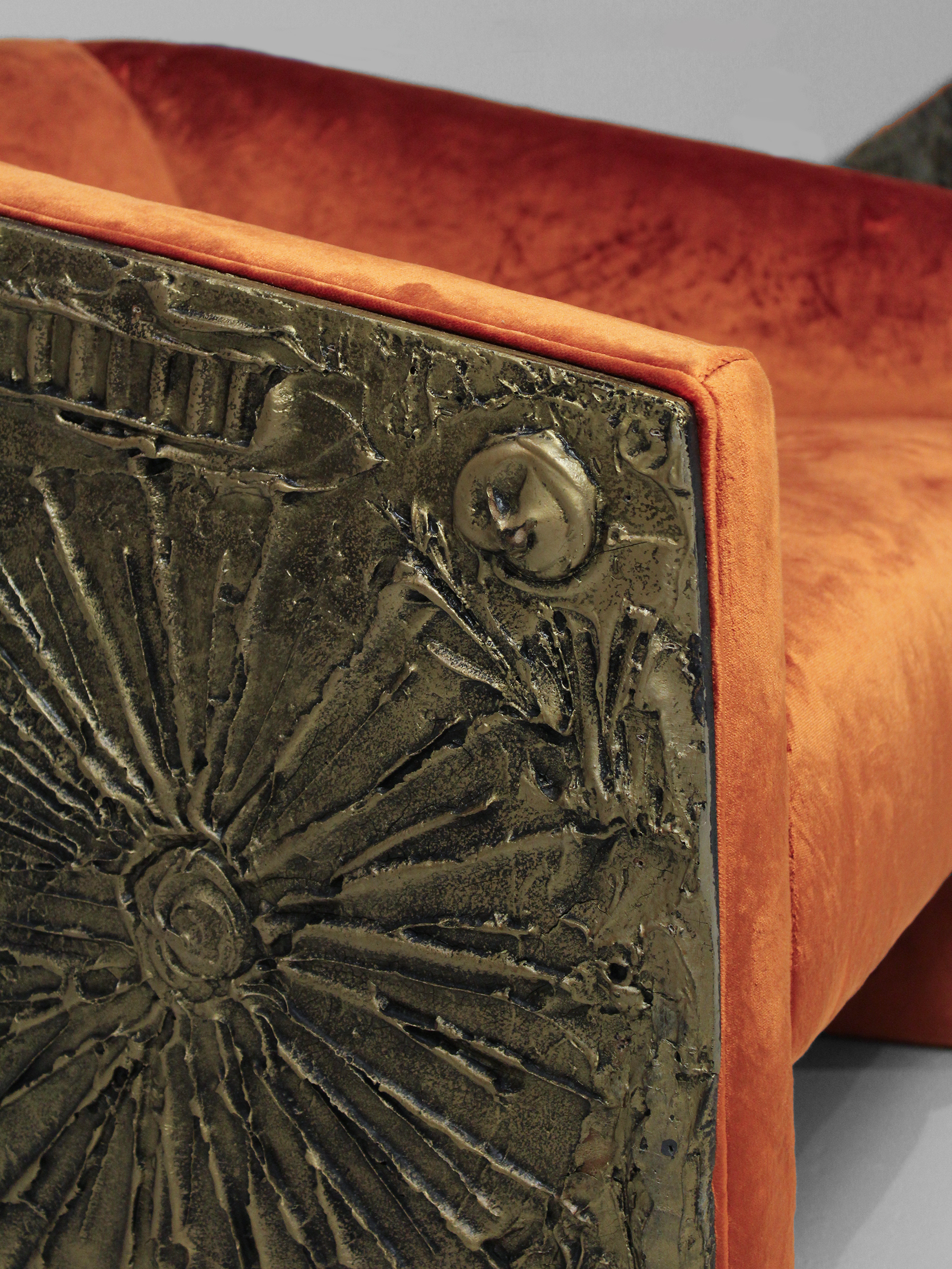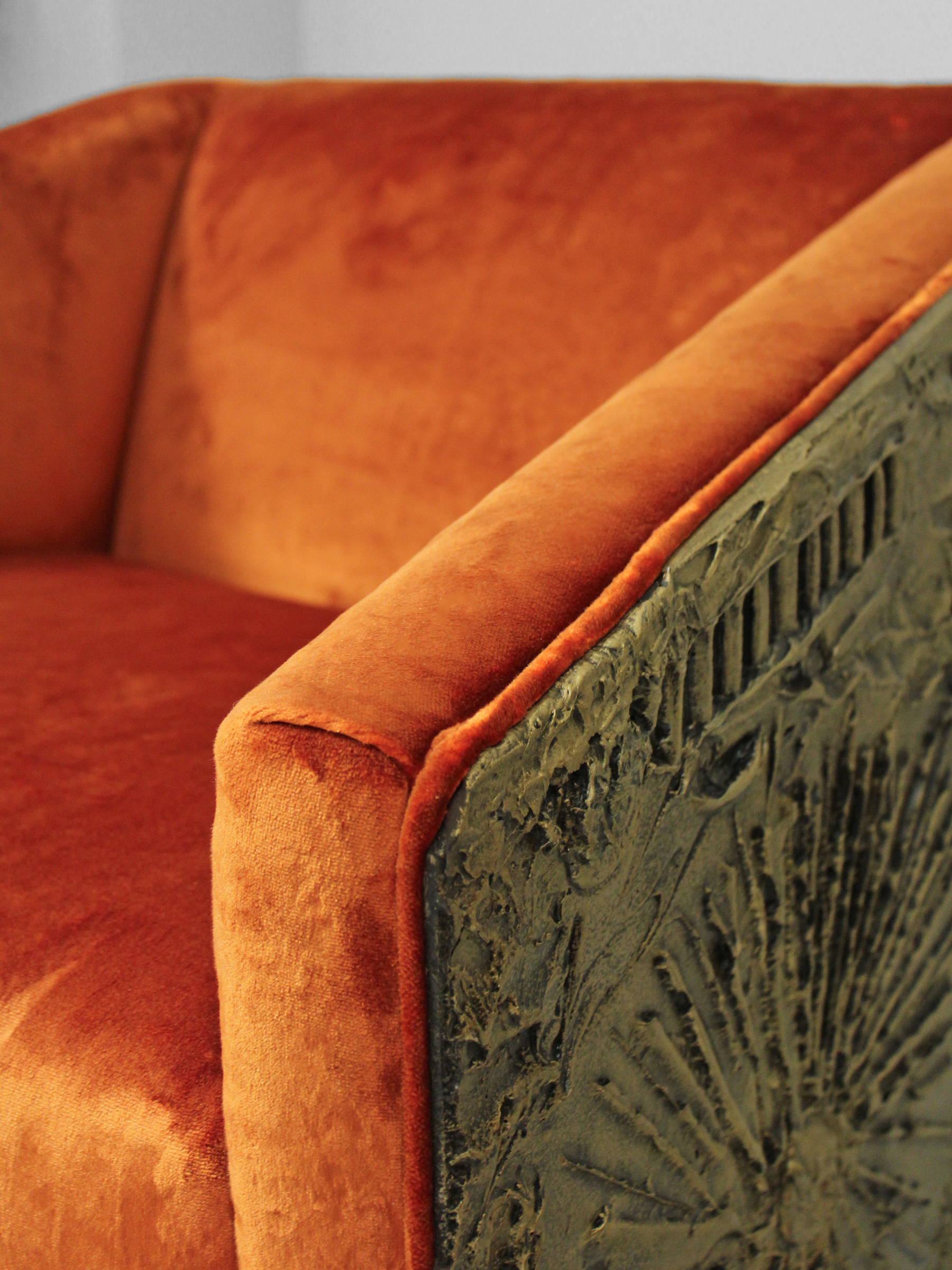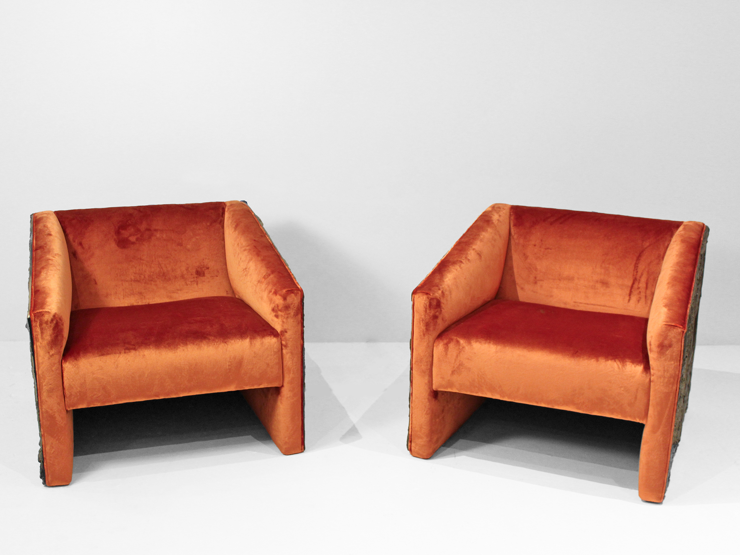 Clean, curving creations such as glass-topped walnut tables made Adrian Pearsall and his firms (Craft Associates and later Comfort Designs) leaders in popular American furniture design from the 1950s into the 1970s. The chairs are formed of sculpted bronze resin (referred to as “Goop”) over a molded plywood form, and archivally reupholstered in a lustrous apricottoned velvet from the noted Italian fabric house Dedar.