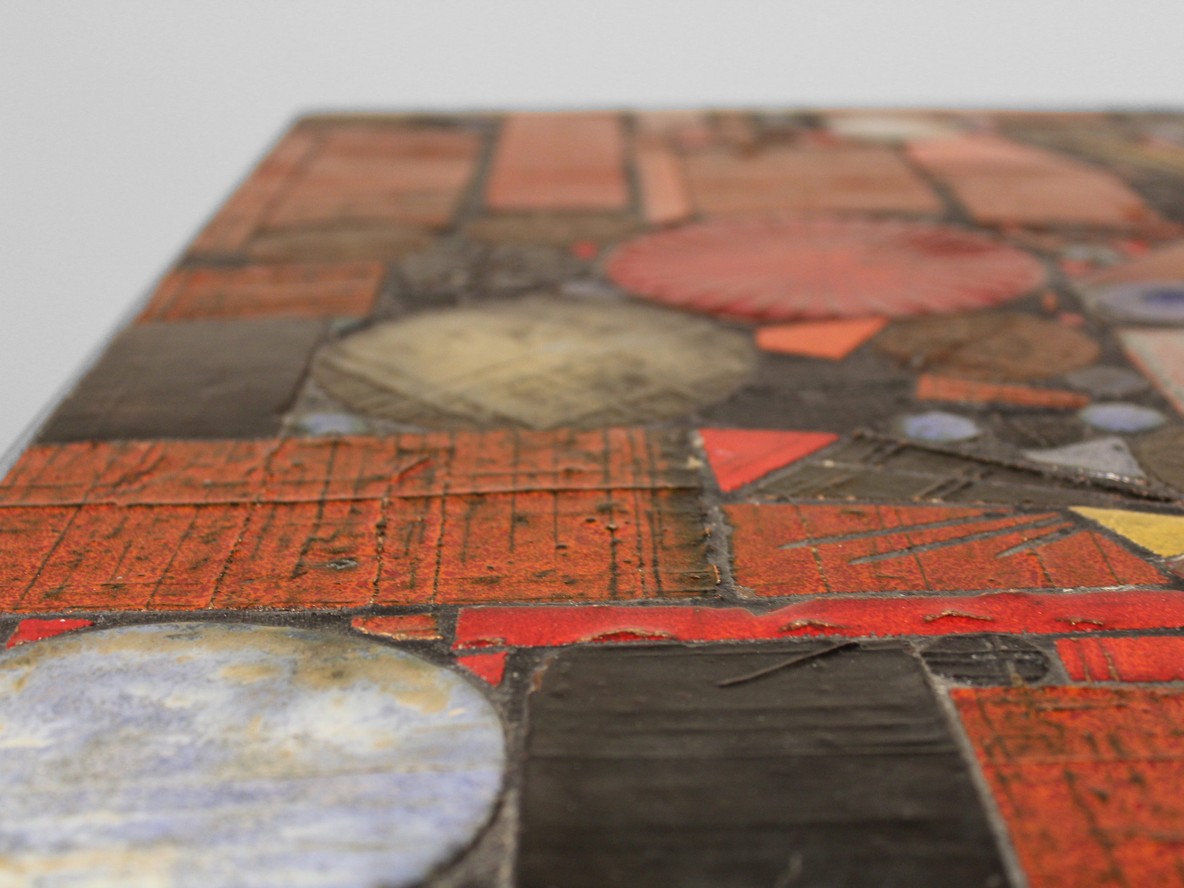 This piece presents a striking statement that fuses Brutalism and Modernism. Belgian designer, Jules Dewaele, created this vibrant ceramic table at his workshop Pia Manu (“a creative hand”). Dewaele had begun the 1960s working at Rogier Vandeweghe’s Amphora atelier near Bruges, Belgium, experimenting with innovative glazing treatments and firing techniques. The results demonstrate the success of his efforts. The table’s ceramic tiles — each one of a kind, with embedded reliefs — combine in a dramatic mosaic pattern.
