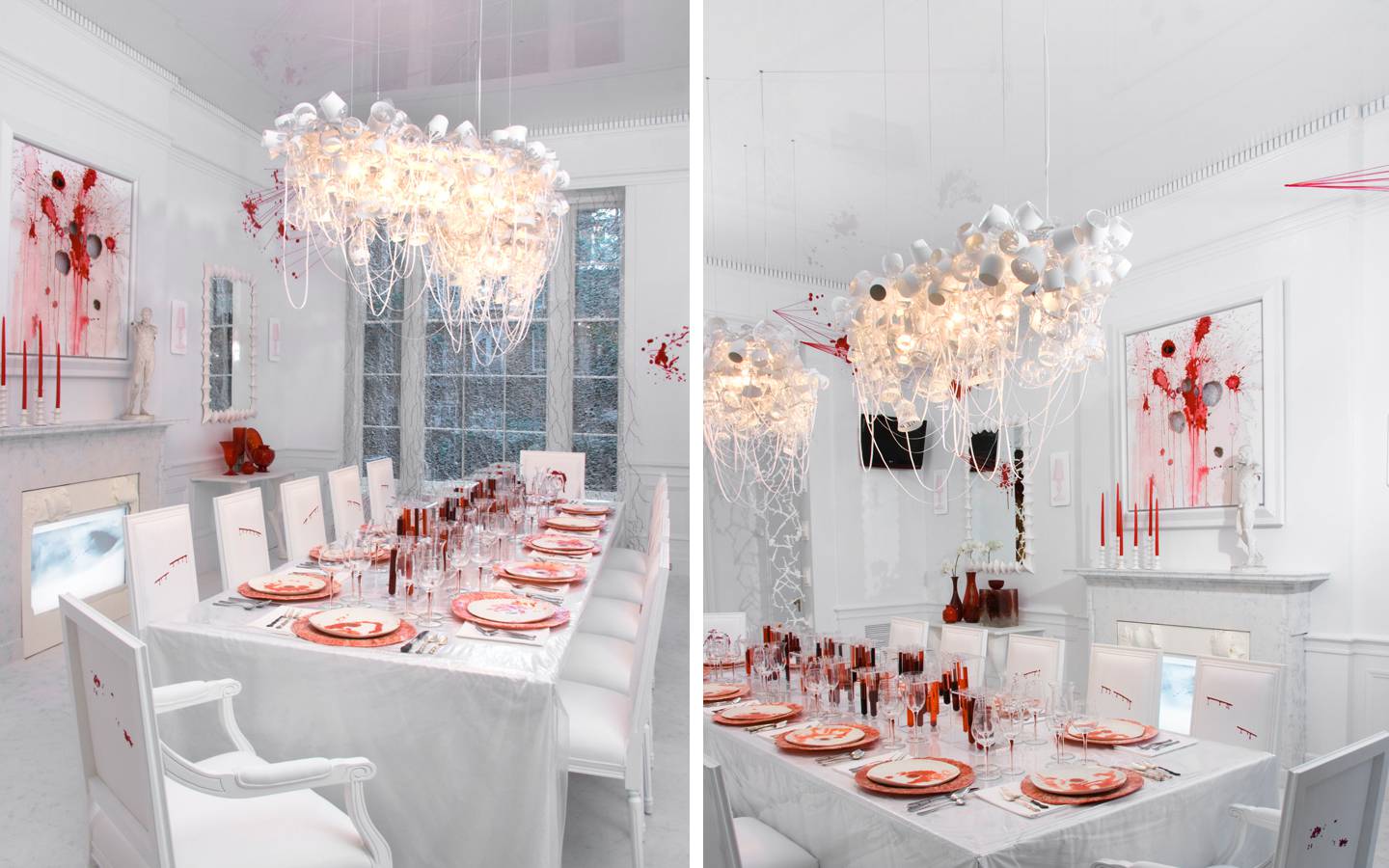 Paint-coated wine goblets hand-dipped in latex paint and tied together with ribbon