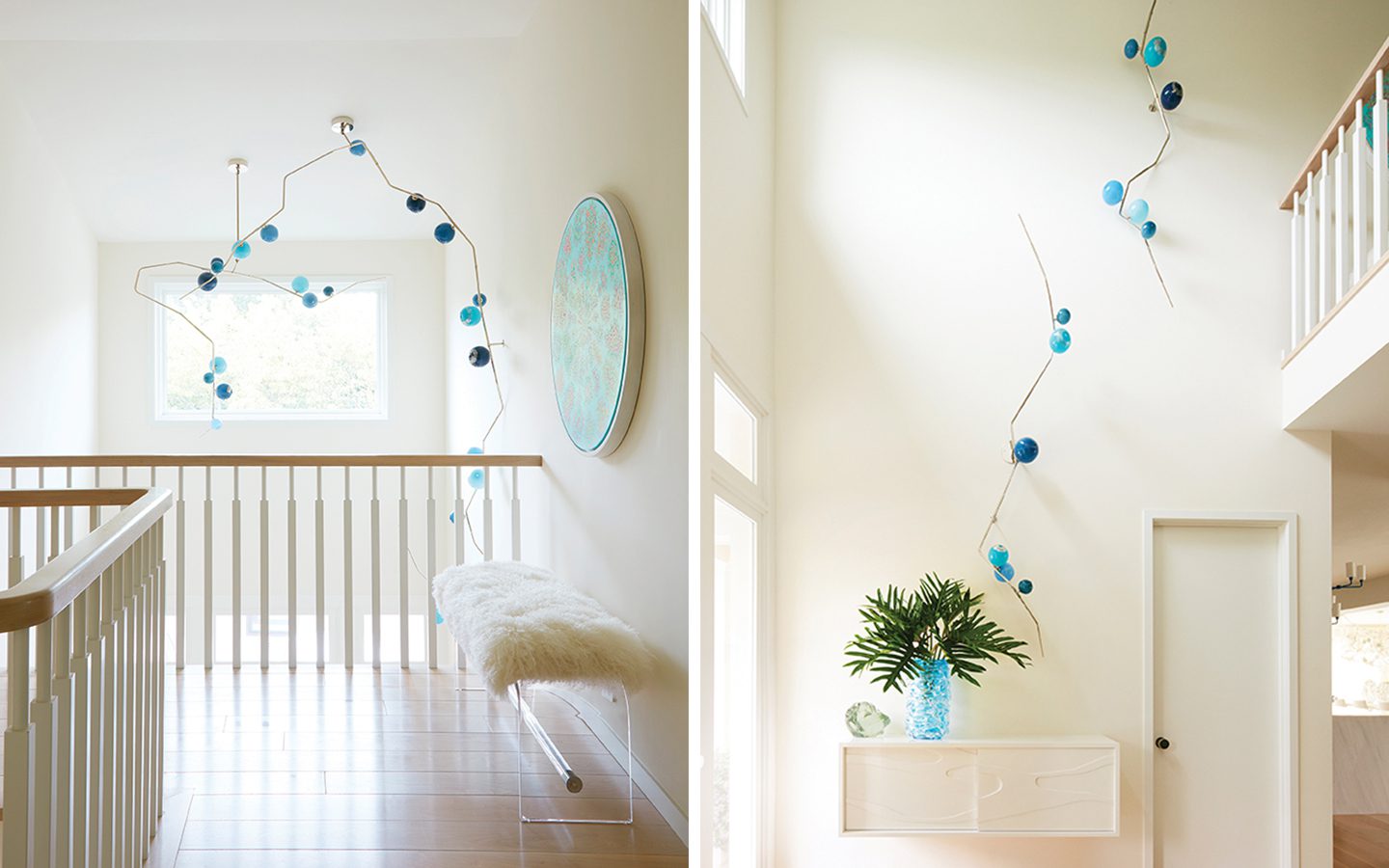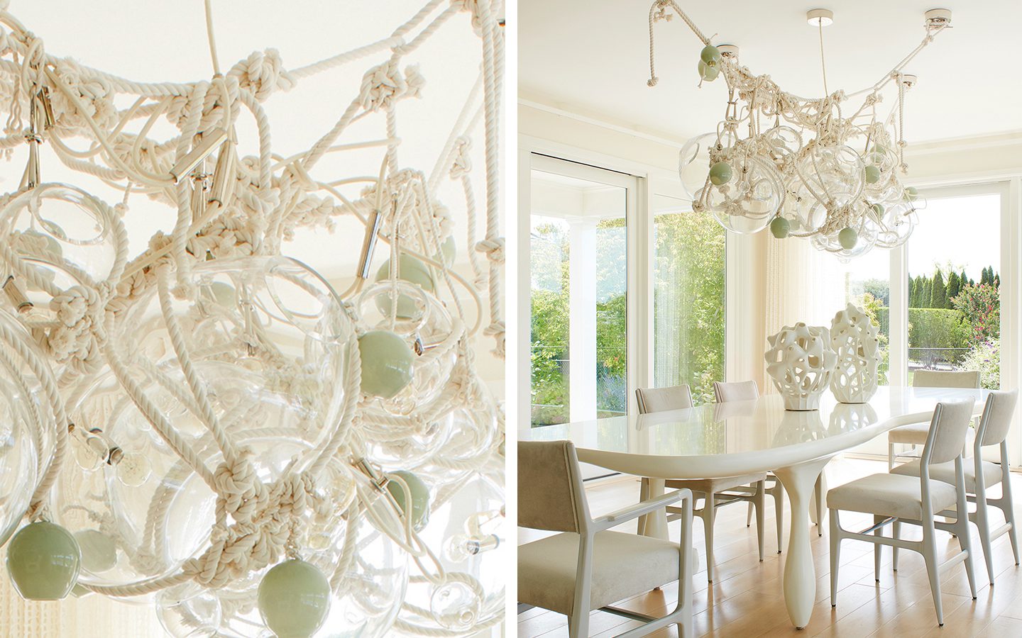 Clear glass globes and natural white rope, assembled and hand-knotted on site by Lindsey herself, with custom polished nickel armature and canopy