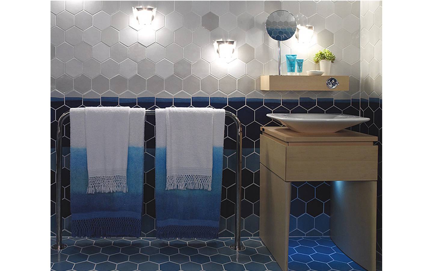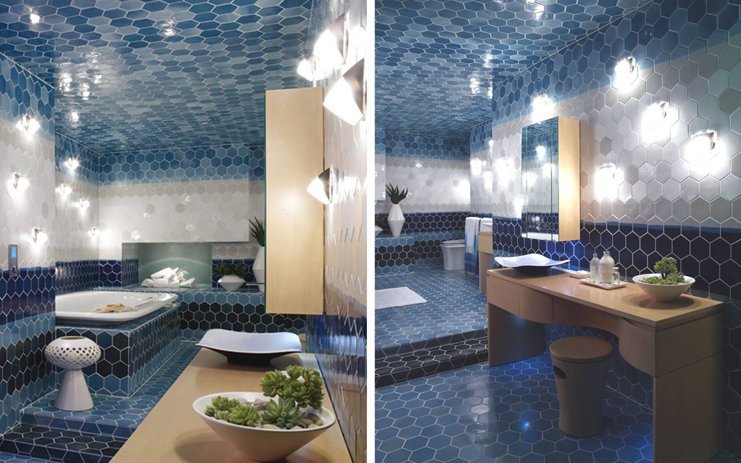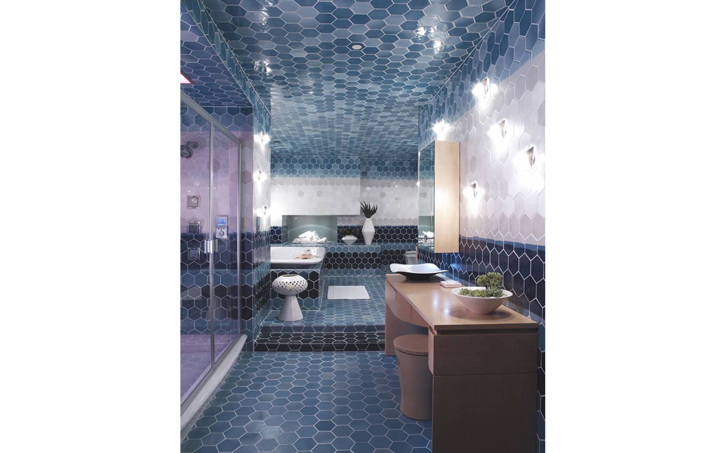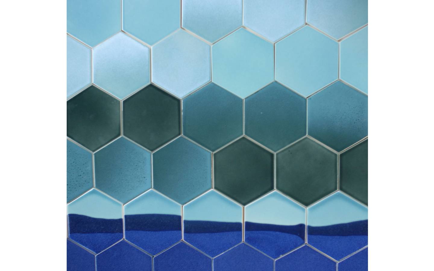 The idea for the “Caldera” tiles came from the breathtaking views from the village of Oia on the Grecian island of Santorini. Inspired by organic and op-art mosaics from the 60s and 70s, the blue and white tile radiates the kiss of Mediterranean light. Fabricated by Heath Ceramics.