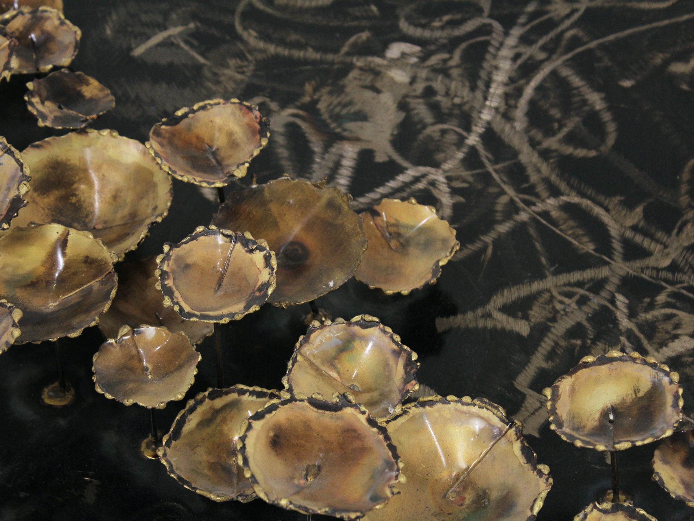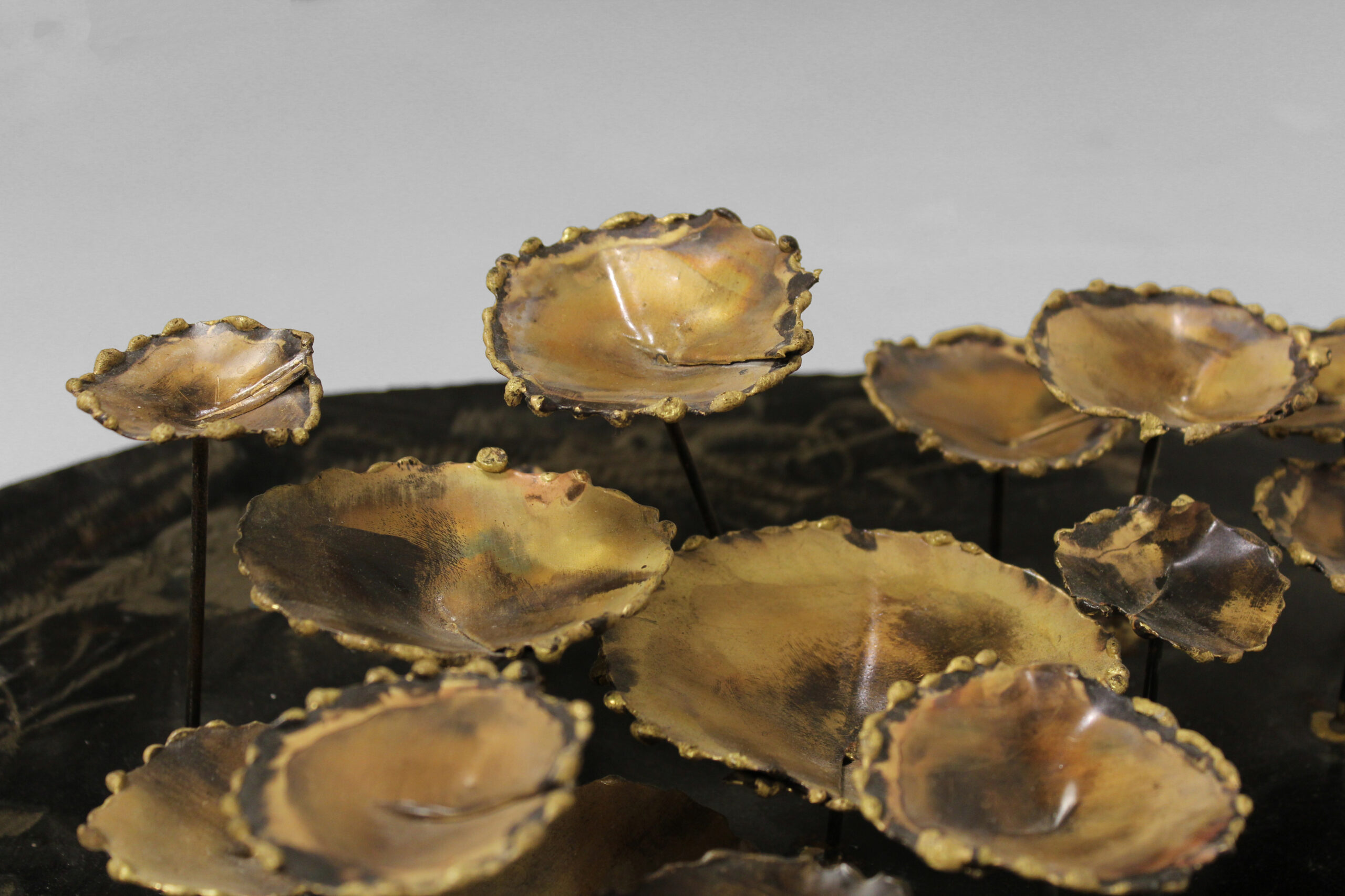 Since 1963, master metal sculptor Silas Seandel has built a reputation as one of the leading creators of decorative art in the United States. His New York City studio has seen decades of dazzling designs in brass, bronze, steel, and copper. Eschewing enamels or veneers, Seandel achieves colors solely by transforming the nature of the metal itself, with his own special applications of acids and heat treatments — as in this one-of-a-kind metal artwork, signed by the artist in 1967.